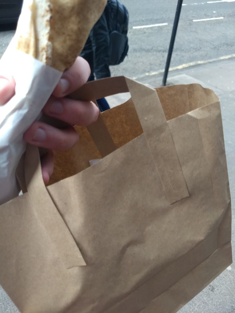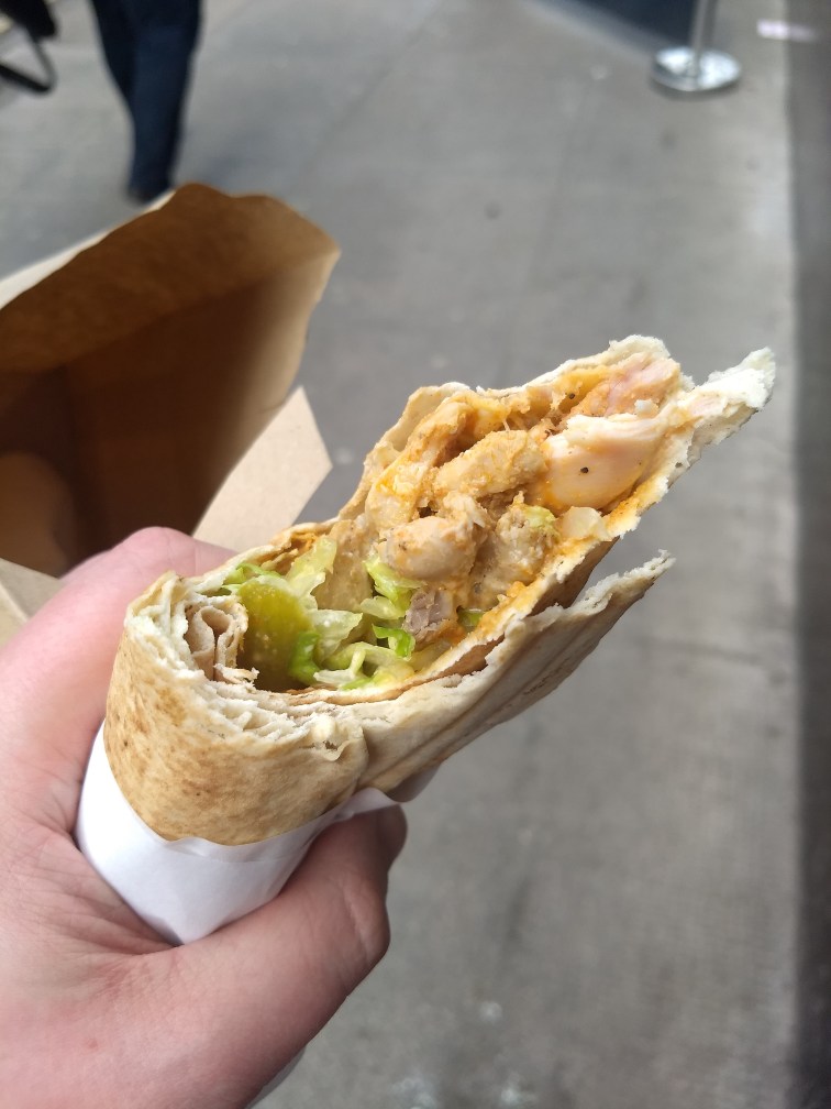 I looked around as I decided whether this would be a carry out or a sit in job. It’s a nice place, though deserted at time of visit, I dare say this will change. I settled on a takeaway in the end; and a chicken shawarma wrap instead of a mix. “Ahh, very good” came the response, almost as if they didn’t have the lamb on that day or something, “you’ll like the chicken! Very good, the chicken. Garlic sauce!”. It was like talking to the human equivalent of a Donald Trump tweet. But he was right, it *was* good. Here comes the now obligatory half eaten wrap pic: