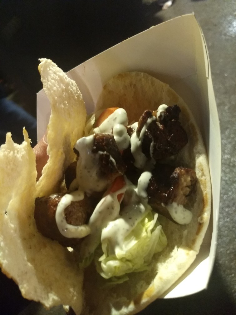 Well, the sign said souvlaki. For a fiver. Even though the picture looked like gyros, it was worth giving it a go. Here’s what I ended up with:
