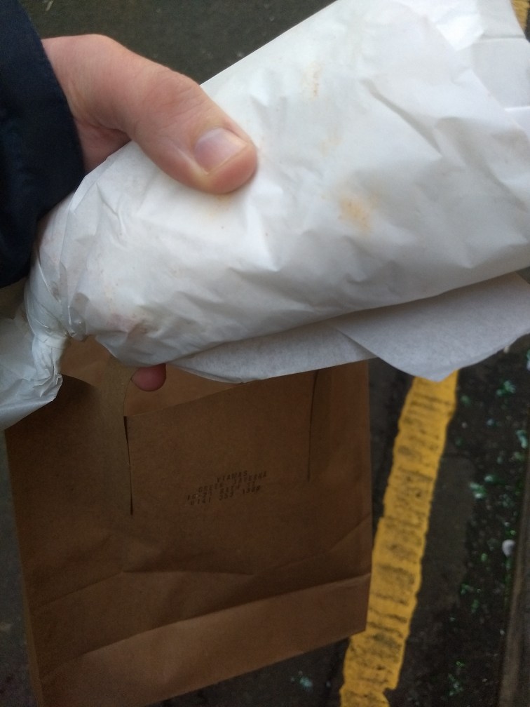 Ahh yes, the “half naked” shot. So what did I get? How was it? Etc. – I went for the chicken souvlaki – as I explained the last time, it’s basically Greek shish. Big chunks of chunky bird, in a pita bread, accompanied by Tzatziki (mint/cucumber yoghurt), tomato, onion, chips, and liberally coated with paprika. I say liberally, there was a lot. That big bit of chicken atop the photo I think tells it’s own story – this was not a half measure. Reasonable prices didn’t mean unreasonable portions. The chips were well done, suitably spiced, possibly a bit too much tzatziki but I can’t complain, it gave me a chance to put the free napkin to the test. (Spoiler: it worked)
