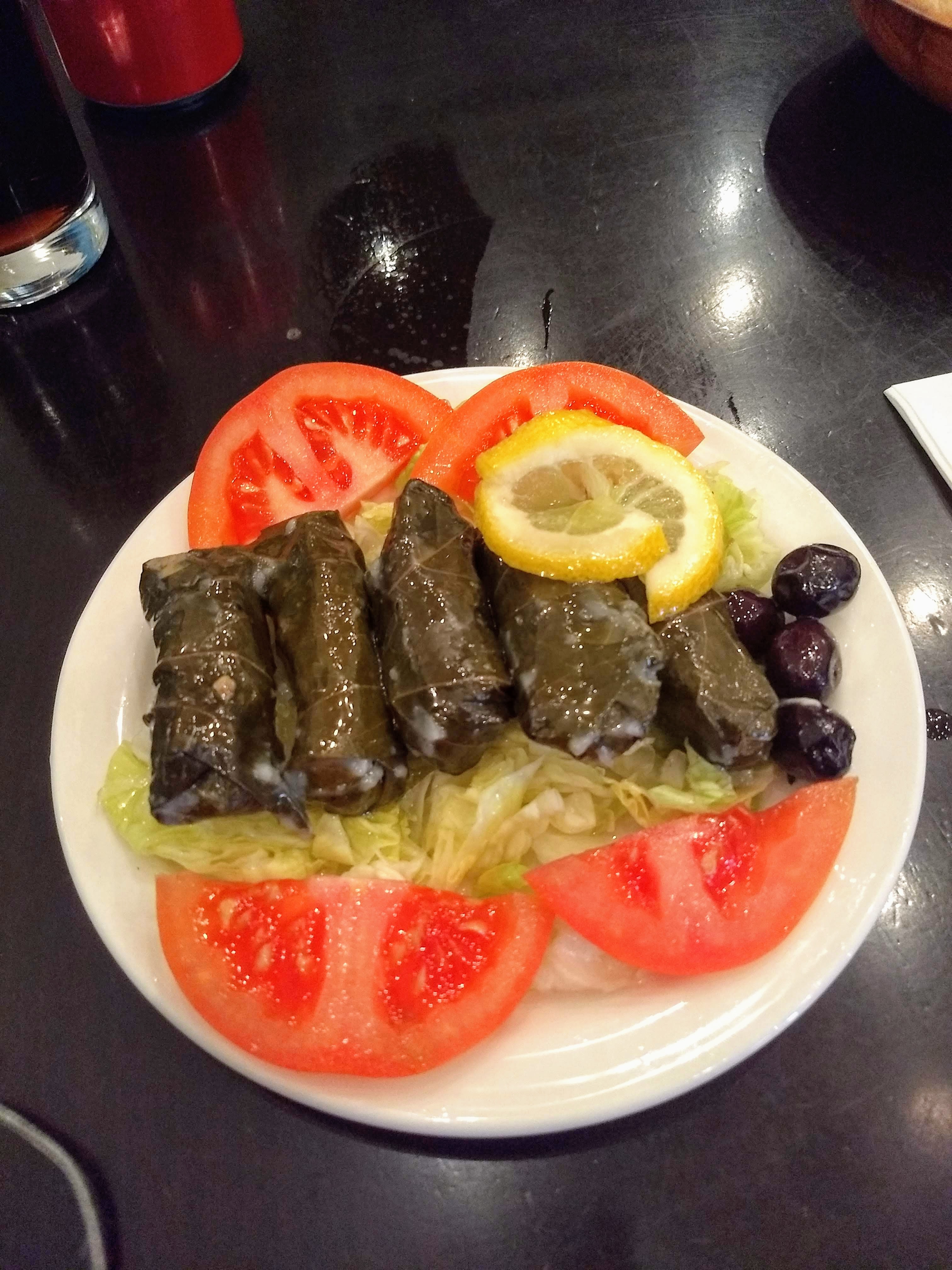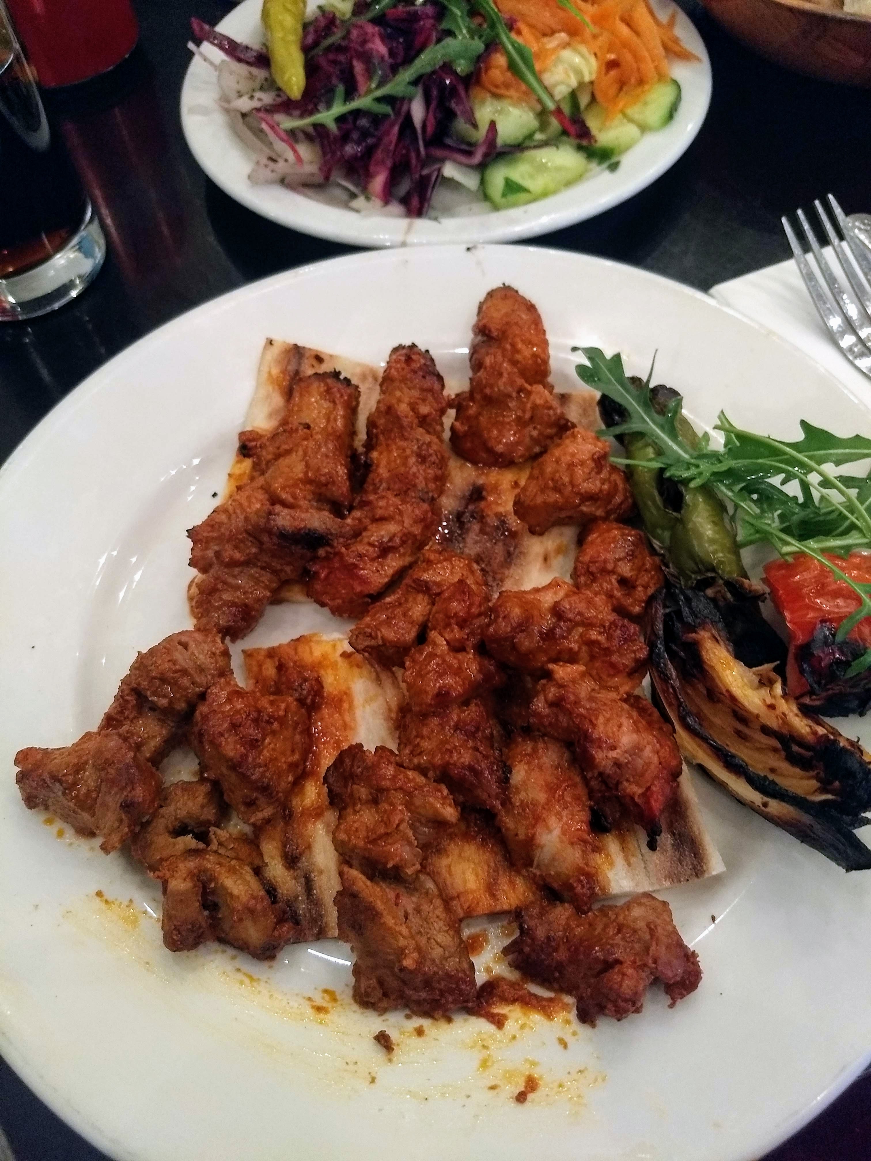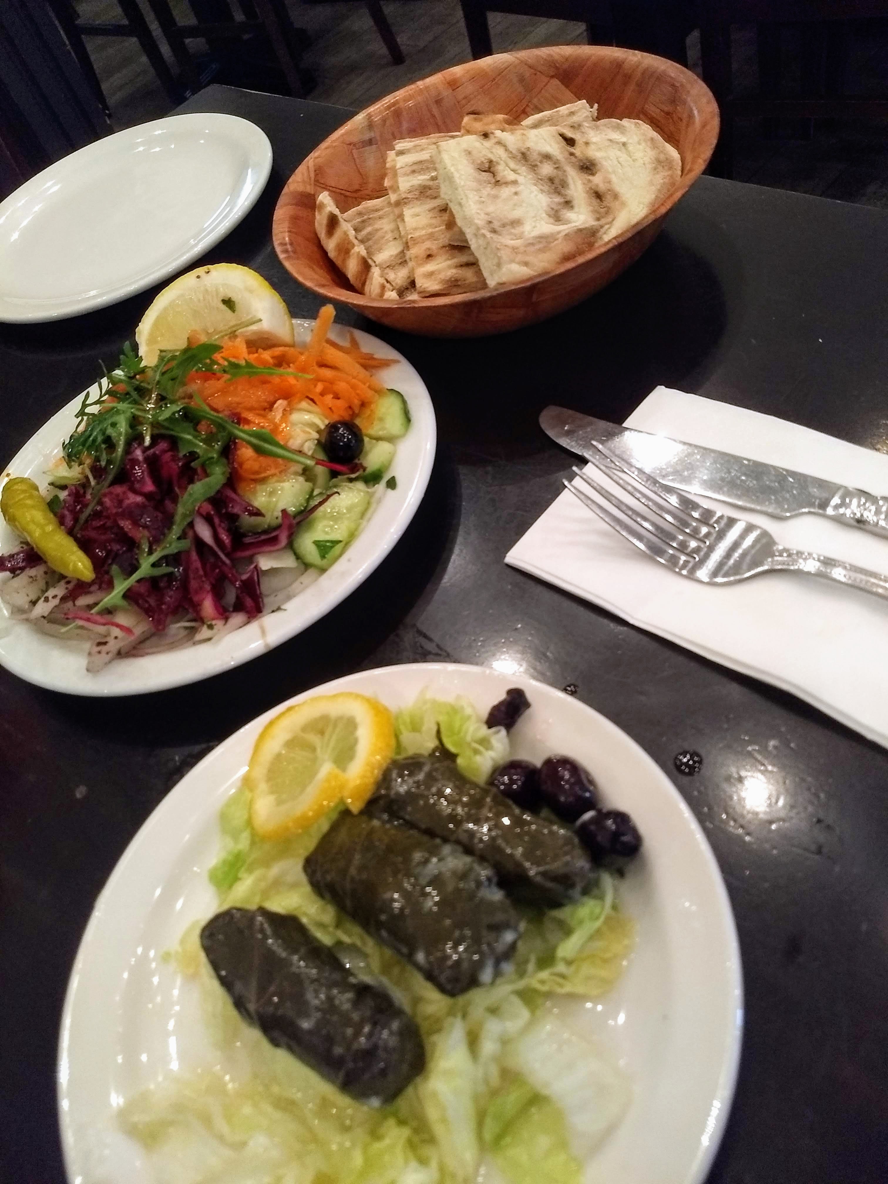 Suddenly, the waiter ambushed me with more plates. I had ordered the Dolma (thats the vine leaves) and the Lamb Cis (shish) as part of the lunch deal. The menu read “served with salad, grilled peppers, grilled tomatoes and grilled onions”, yes, but I was kinda expecting it to be on the side – so when a plate full of rabbit food arrived, I was confused! Don’t get me wrong, I still ate it, because y’know, food, but I’d got a lot more than what I bargained for. The bread wasn’t even mentioned, and I got a plate full of pitta! This I tried to eat, but failed due to bread aversion.