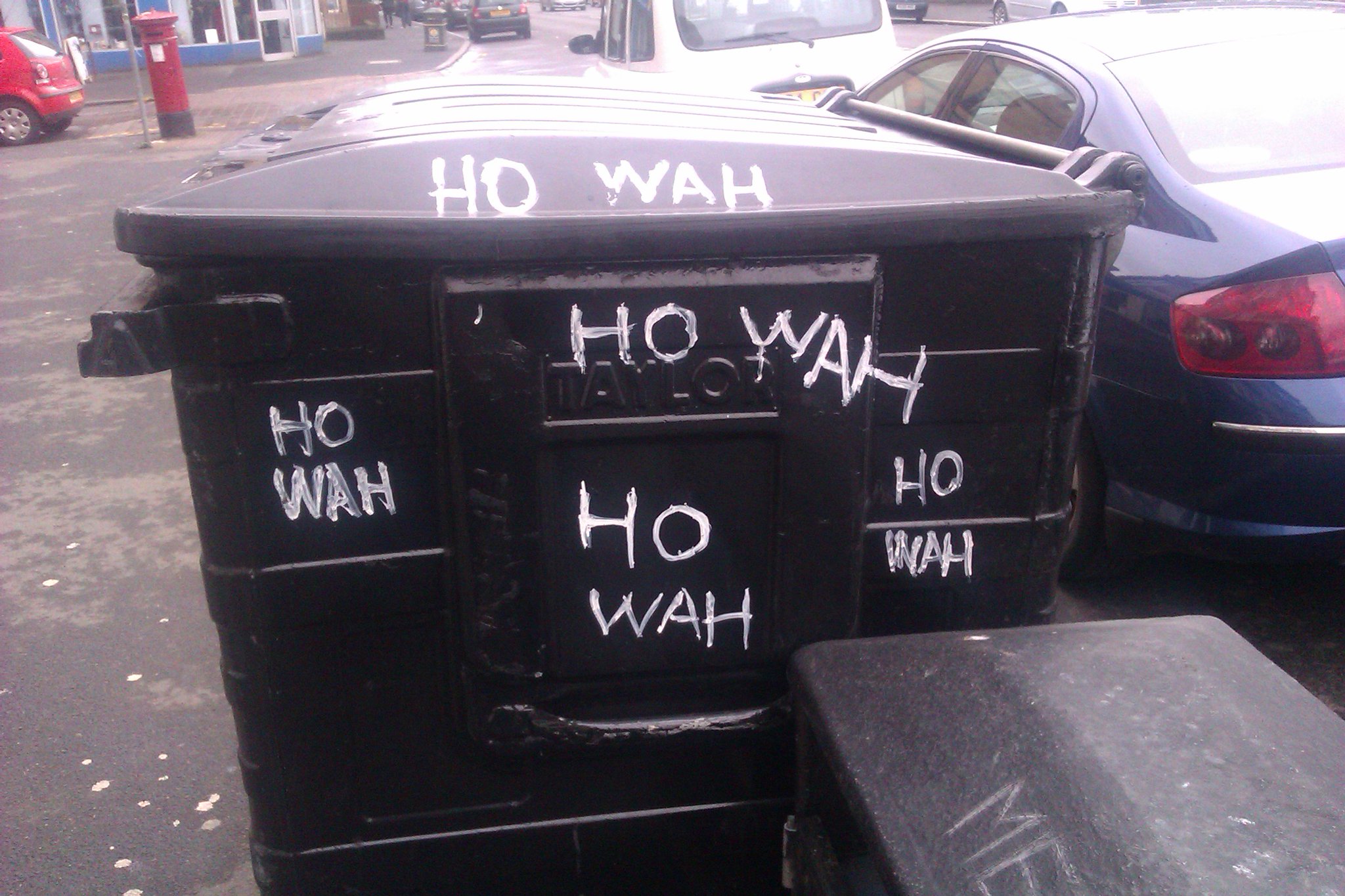 Well, I’m not veering hugely off topic – because this is entirely relevant. It’s a commercial waste bin, owned by the good people of HO WAH in Shawlands. I know it was owned by HO WAH because, well, they left their mark. Unfortunately, the photos of the other sides do not exist anymore but this erstwhile Chinese restaurant in Shawlands was very protective of its bin, and I believe had, across all four upright sides, written HO WAH no less than thirty times. I was unable to check the base, but given HO WAH was written on the lid, I wouldn’t be surprised if the base was tagged as well.