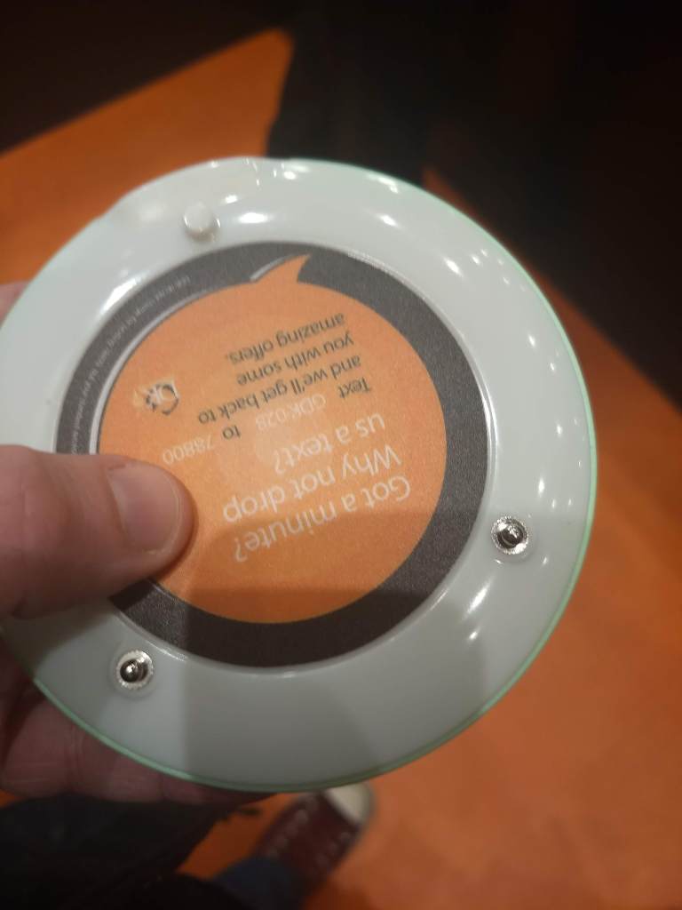26 minutes after ordering, the Space Disc 9000 (not its real name) vibrates my hand off, during which time it has been in my hand nearly the whole time apart from a brief moment when it had been temporarily snatched from my hand so that a staff member could read the number on it. He could have asked. Anyway, I collect my order and off I go – and it was quite impressive!