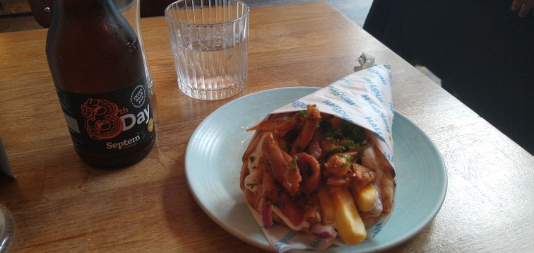 The beer was very nice, as was expected (though at £6.50 a 33cl bottle they may as well change their name from “Halloumi” to “Halloumlight Robbery”). The gyros were *very* good, which I wasn’t expecting. I mean, I was expecting OK to good, but this was exceptional, for all of it that there was. The tzatsiki was unnoticeable – it served its purpose without taking over the whole meal – a criticism I levelled at the no-longer-there Mr Nicks in the St Enoch food court. The chicken was top notch, and the chips were probably the best I’ve ever had in a gyros in Glasgow.