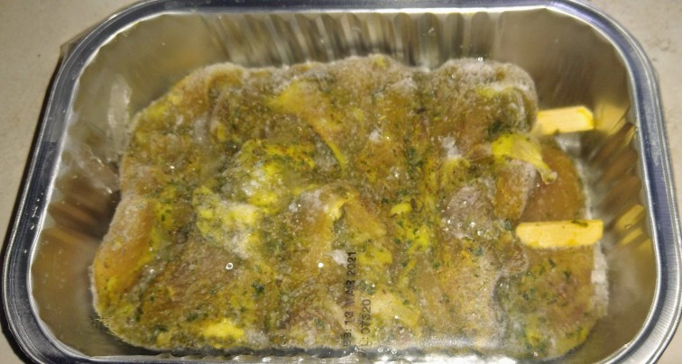 Flipping to the back of the packet, I am informed that this is “Chicken Drum and Thigh Meat Pieces in a Lemon and Herb Peri Peri Marinade on Wooden Skewers”, takes 95 minutes in the oven, and under no circumstances should this be reheated. This poses me with an immediate problem – I’m just one guy, who wants to exit lockdown with a smaller waistline than the waistline I had when I entered lockdown, and this is nine hundred and twenty-four grams of chicken kebab. How on earth am I going to get through this??? In the end, I took the decision to eat a quarter of it, cutting some of the cooked kebab from the side and ends, which rather fortuitously means that we can get a side view of the cooked product: