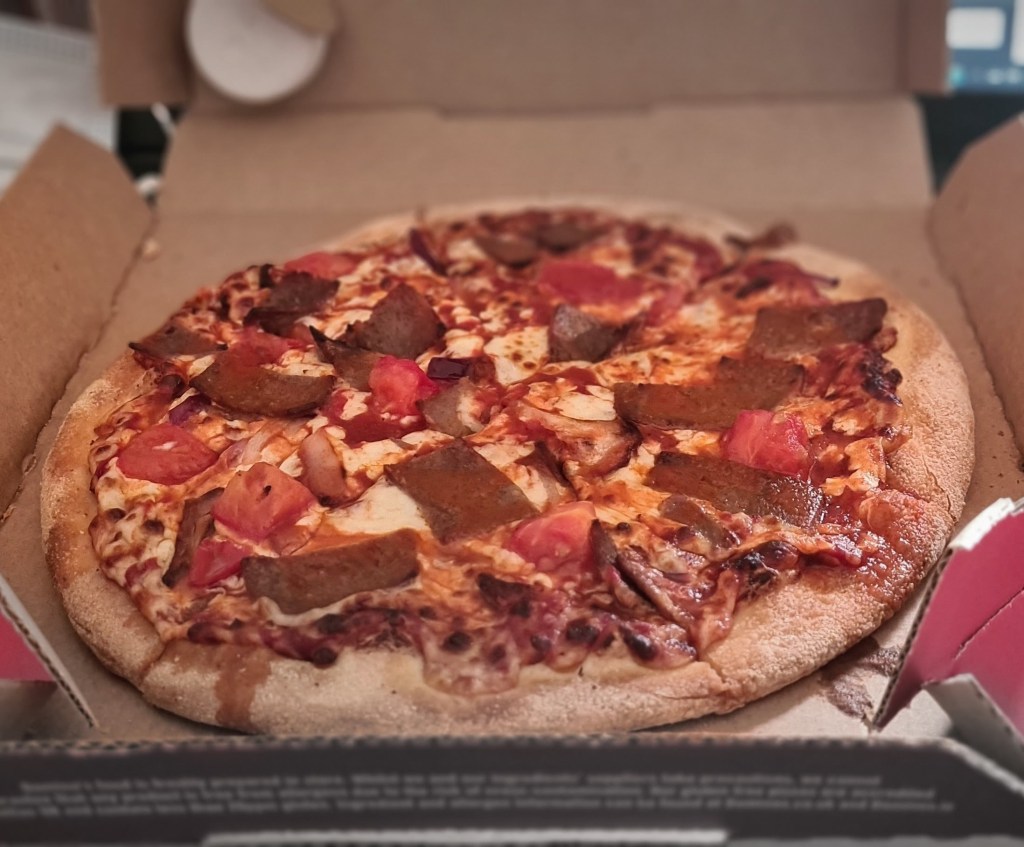 Domino’s are by no means the first people to have put doner meat on a pizza – your local kebab shop will likely do a kebab pizza of some sort already – and we reviewed Pizza Punks effort a couple of years back (almost to the day – though sadly Pizza Punks have since removed doner meat from the list of toppings, which sucks) – but Domino’s are to my knowledge the first of the Big Three pizza delivererers to embrace greasy pole meat – and it’s to their credit!