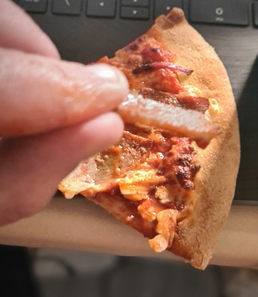 So what’s it like? Well, it’s not bad. It is much as I imagined it would be to be honest – it’s a Domino’s pizza with a handful of kebab slithers on top of it. Taste wise, the Domino’s sauce is the big flavour that I’m getting from this – it is quite overpowering – however I do note that you have the option on the website of changing it to sundried tomato and garlic. I probably should have done. The meat is actually pretty good, albeit limited in size. When I saw the rectangular shape I had vivid flashbacks to the Farmfoods frozen doner which I wasn’t hugely fond of, however having levered a chunk off the pizza base I found it to be perfectly palatable – lightly spiced with your usual doner flavour, and not particularly chewy – i.e. it’s not your standard kebab fayre, but it works well enough on a pizza.