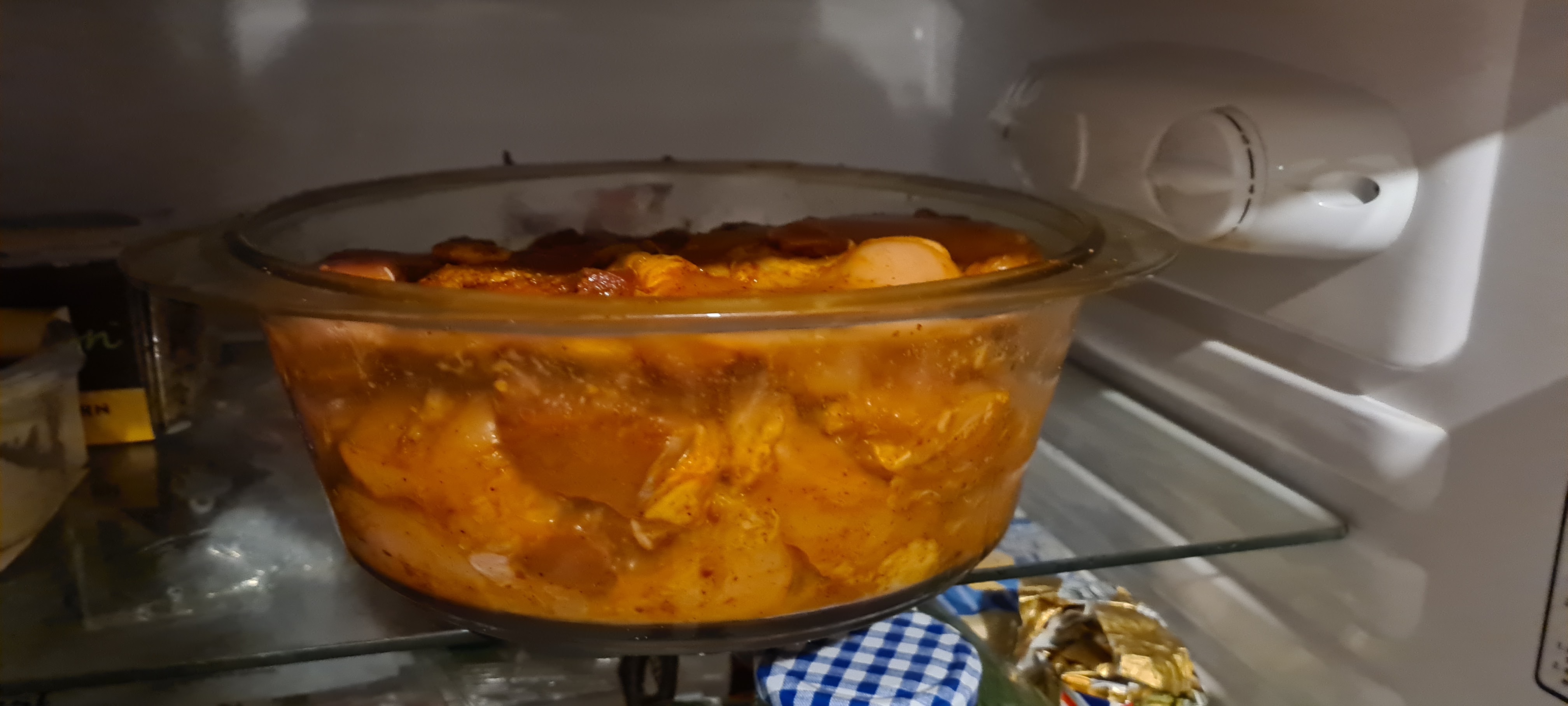 So, step one – marinade the fuckers. In went 8 chicken thigh fillets, 3 lamb leg steaks, and two diced chicken breasts. The marinade itself was a simple middle-eastern affair, with a South African twist*! Two packets of Schwartz brand baharat seasoning and half a jar of Tesco’s own Harissa paste, with a splash of Nando’s Garlic Peri Peri sauce that I had in the cupboard. Bunged in a pyrex casserole dish, left in the fridge overnight to soak, and it looked a bit like this: