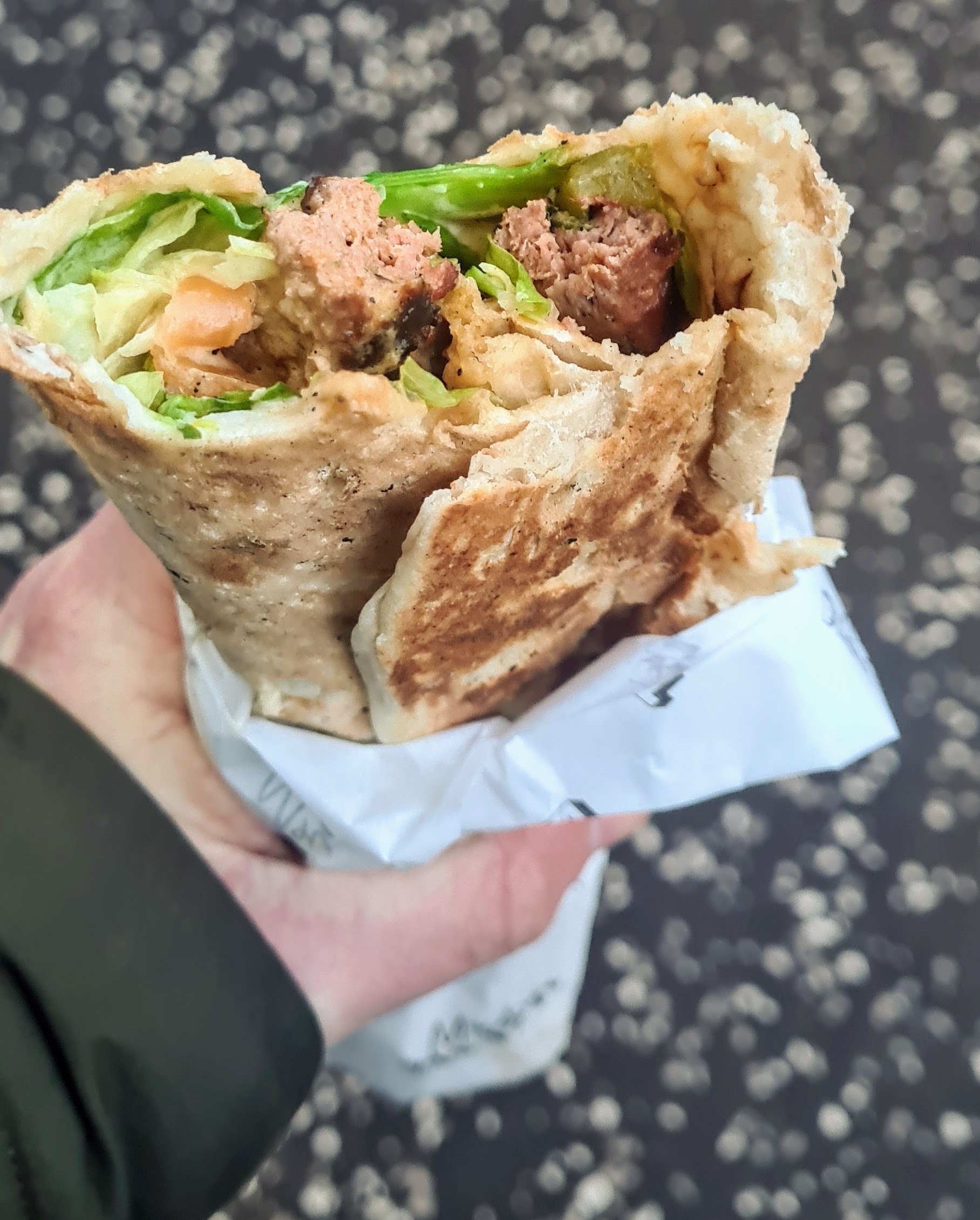 Today’s journey took me to Glasgow’s West End, and particularly to the junction of Woodlands Road and Ashley Street – for those of you familiar with the former road but not the latter, it’s where the mini Sainsbury’s and petrol station are. That, and a food van, which for many years sold crepes and croissants. No longer! Now it sells falafel and related wares, and luckily for me, one of those related wares was a lamb kofte wrap.