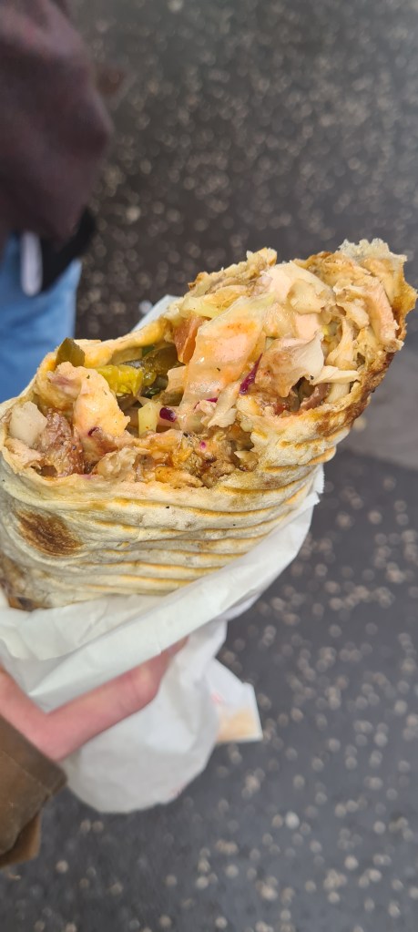 Filling wise, the meat was pretty much bang on, the ratio of meat to salad was possibly a bit salad heavy but I refer you to the above (it’s massive) so I think that’s forgivable. They also split out their salad, Subway style, so you can get the bits you like (olives) and leave out the bits you don’t (pickled whole chillis) – unfortunately, possibly due to wearing a mask, despite asking for olives four times, none were forthcoming. It’s not a deal-breaker, what I got was good… Which reminds me, I’ve not posted a half eaten wrap shot for a while…