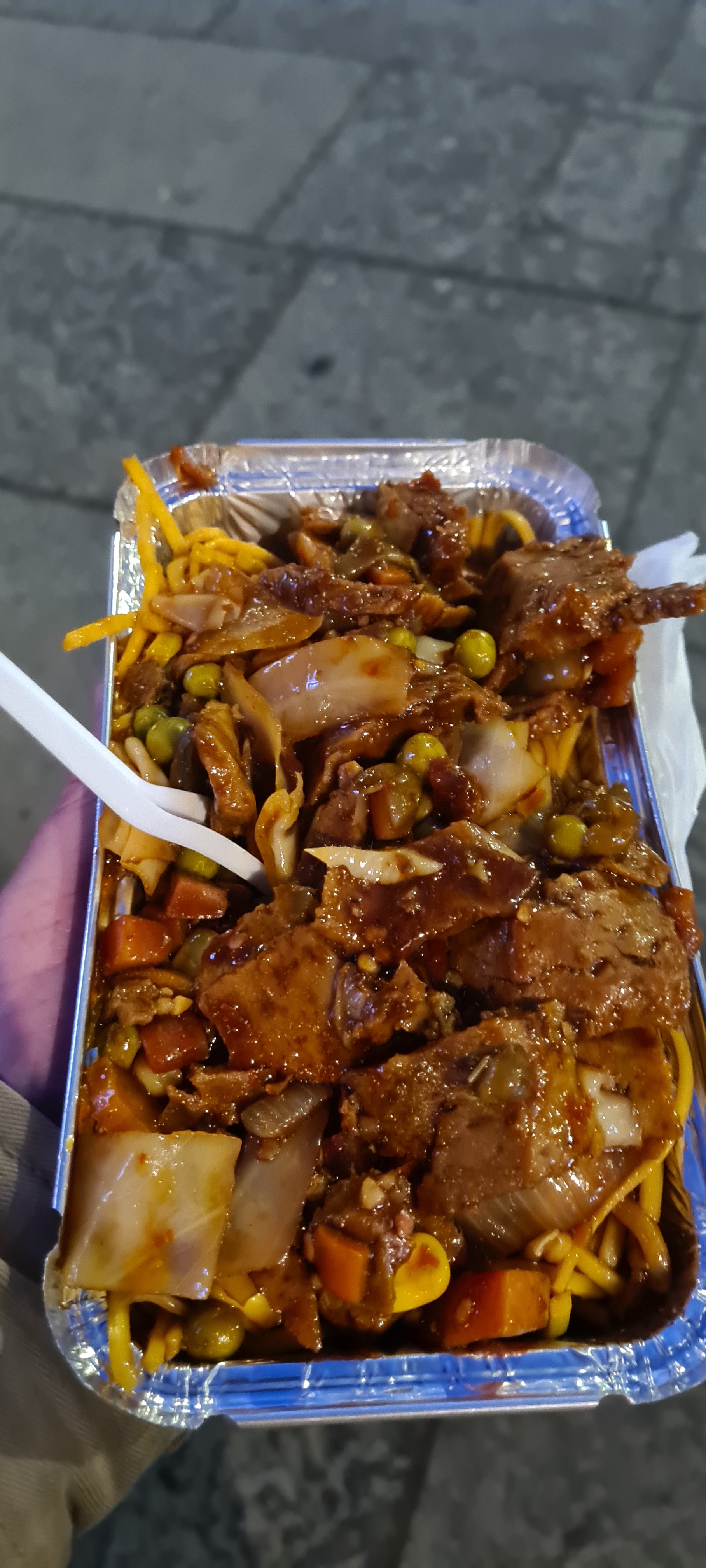 From the St. Enoch Christmas Market in 2021 – I went along and it was the usual stuff, y’know? Exotic meats, Yorkshire Pudding kebabs, wooden toys, Welsh cheese, Bratwursts-in-a-bun, so I spend precisely 5 minutes wandering around, going “hmm. HMM! oh”, pretty much on repeat. Until I got to Wok Man. They were selling stir fries. This picture was the stir fry they done with doner kebab meat on it. It was actually really good – something that I’d happily eat again, I do like a bit of fusion cookety me. After all, if you can get kebab pizzas and kebab lemonade*, why not stir fry?