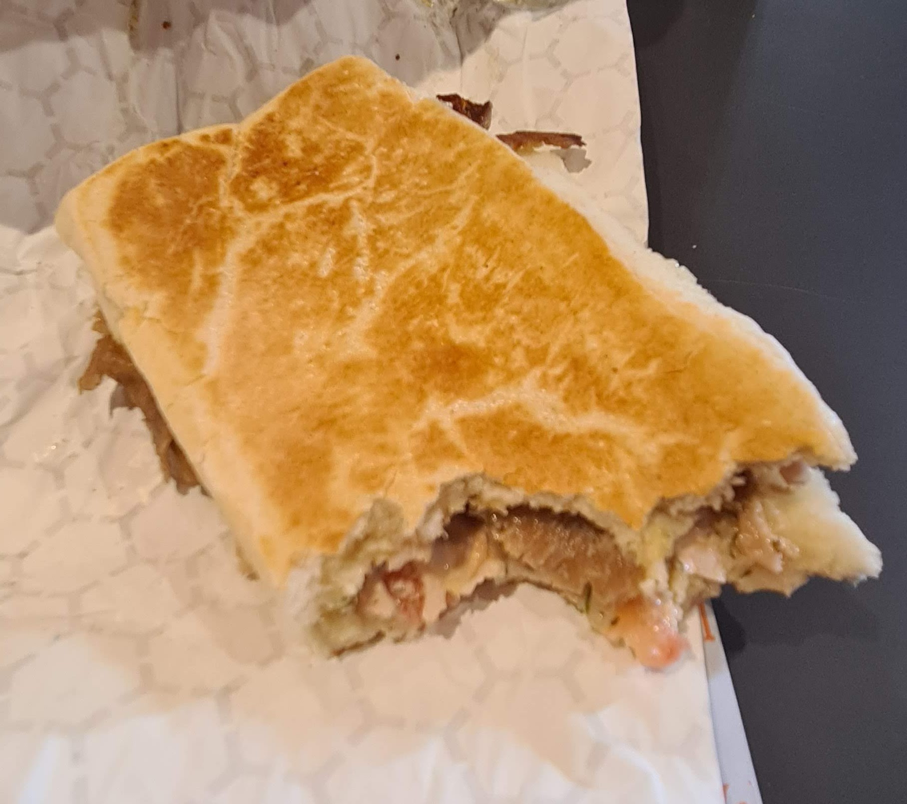 This was one unhappy sandwich. Don’t let the lack of scorch marks fool you, this definitely had been flattened in some kind of a sandwich press – I just don’t imagine it had been in there all that long. It wasn’t cold cold, but it wasn’t all that hot either – and that was just the bread. The meat (of which, I’m sad to report, there wasn’t much of) wasn’t all that warm either, but that was ok, because you couldn’t really taste it anyway, because of the abundance of cheese, onion, and the two garlic sauces. Weirdly, if there had been a smidgen of red sauce in here, it may have improved the flavour somewhat, but I was pretty underwhelmed, all things considered. A nice cheese savoury toastie this would have made, but not a doner panini.