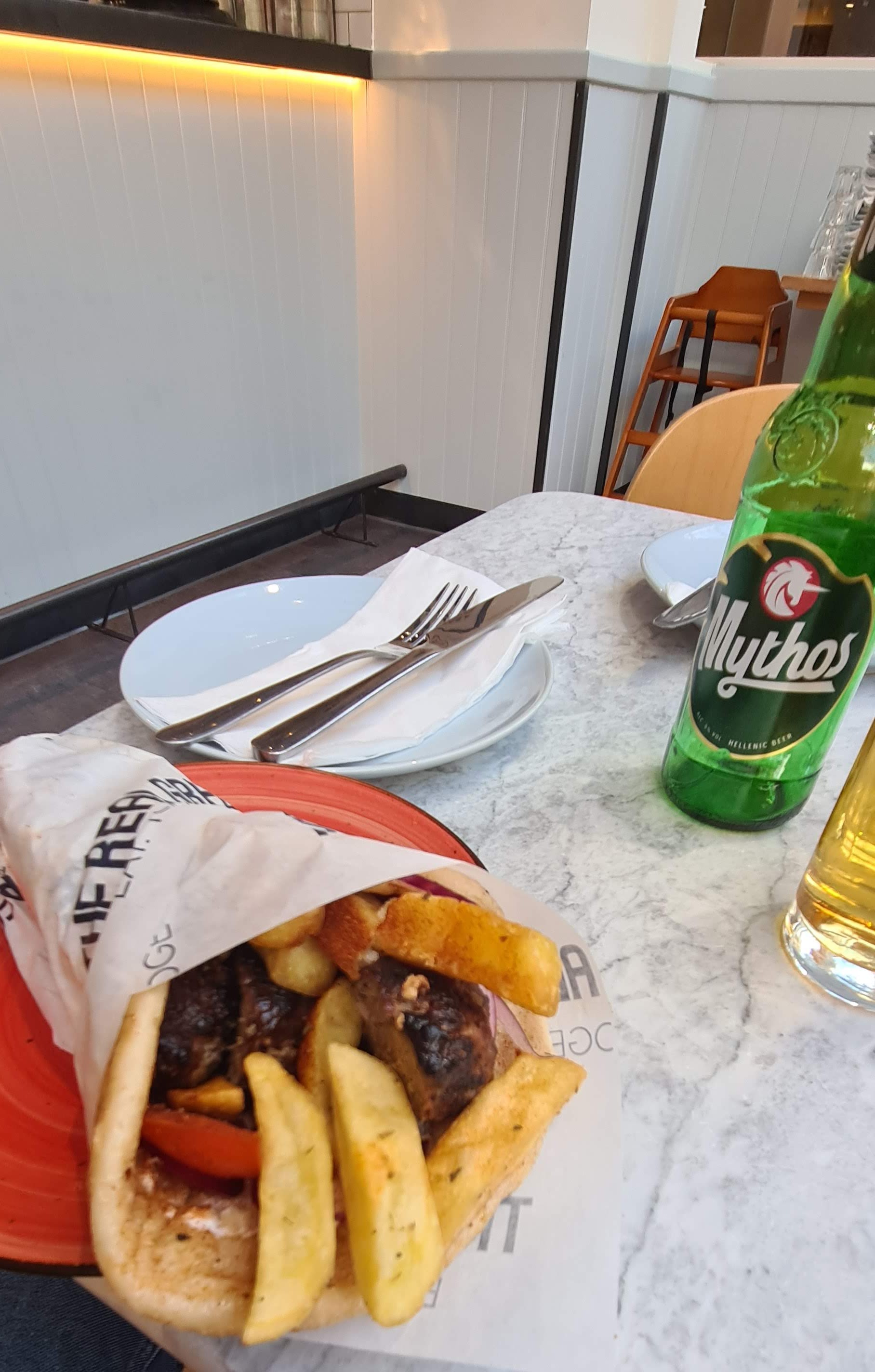 Lamb Meatball Souvlaki + Beer, came to about £15 all in – 10% tip automatically added to bill.