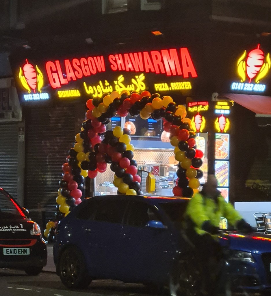 Last night, as I was returning home on the last Subway to Cessnock, I noticed that Glasgow Shawarma, which occupies the site of the old Serene Coffee House on the corner of Paisley Road West and Percy Street, had an archway made out of balloons outside its door – and that the shop appeared to be shut.